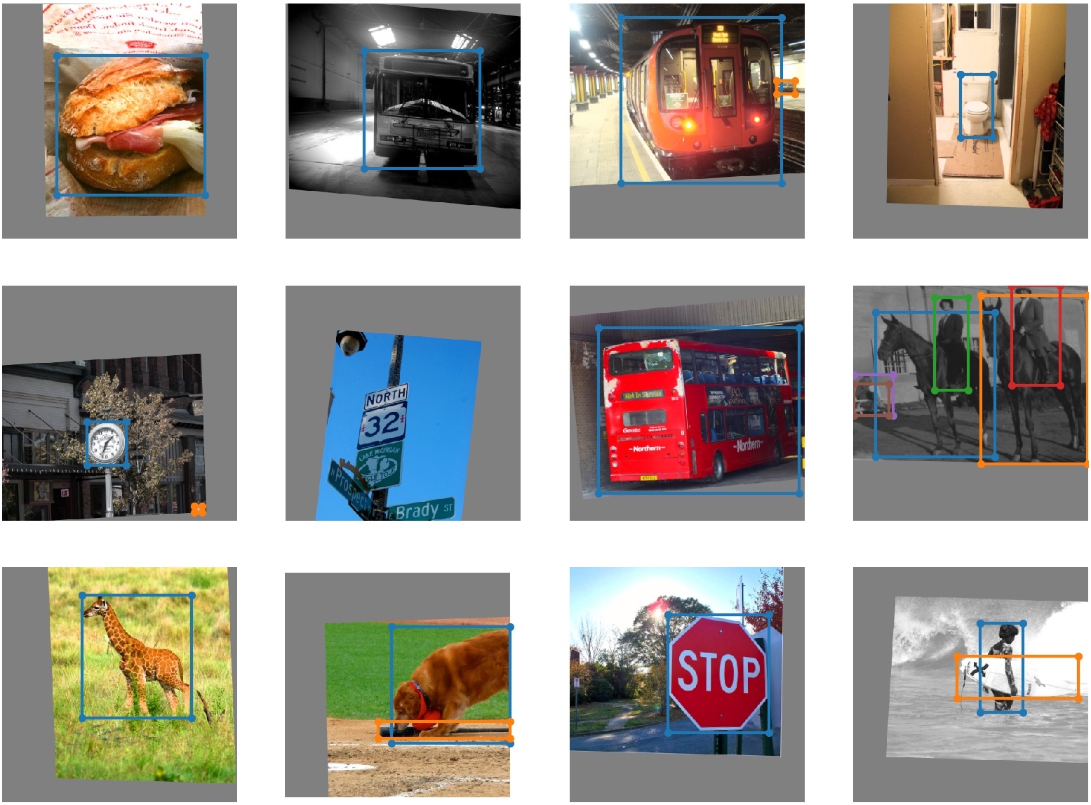 datasets.py applies random OpenCV-powered (https://opencv.org/) augmentation to the input images in accordance with the following specifications. Augmentation is applied only during training, not during inference. Bounding boxes are automatically tracked and updated with the images. 416 x 416 examples pictured below.
