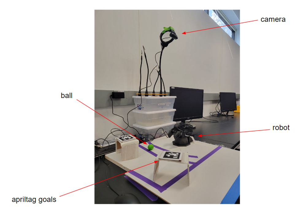 This is the setup for play-catch. There is a board that is taped off to indicate the boundaries of the camera. The robot is placed in the center of the bottom half and its base-link is treated as the origin (world). There is a ball that is covered in green tape for colour detection, and Apriltags that are placed on top of goals. The camera is situated around 80 cm above the board to get a full view of the board.