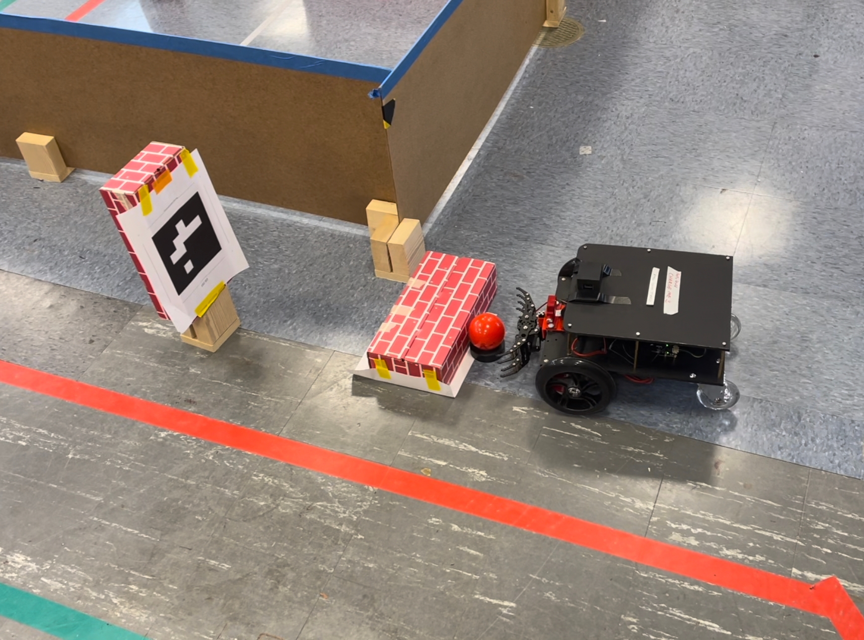 At first, we imagined that in order to achieve this task, we would need to create an alley out of blocks, map the space, and use RGB for ball detection. None of this ended up being how we ultimately decided to implement the project. Instead, we opted to use fiducial detection along with line following to implement ball pickup and bowling motion. The fiducial helps a lot with consistency and the line following allows the robot to be on track.