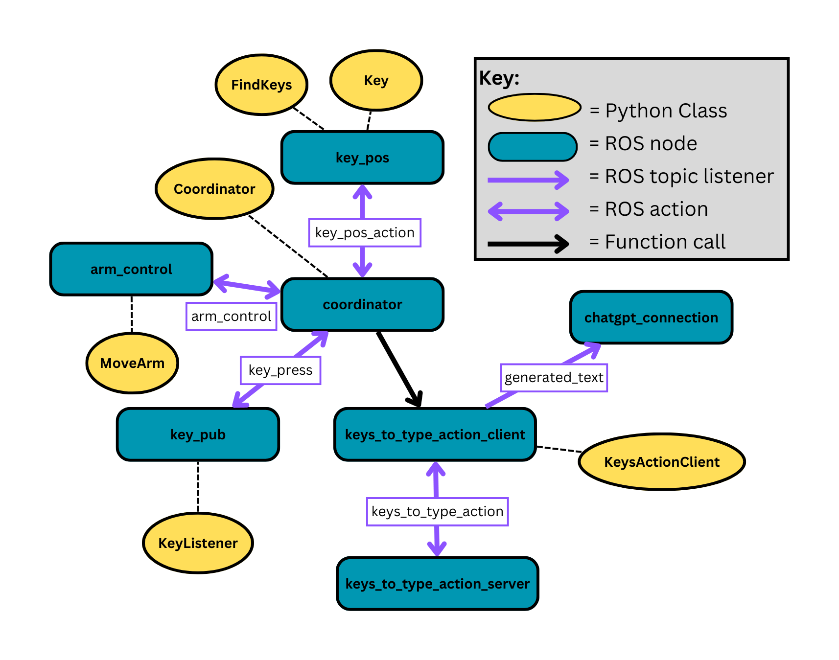 The project works by having a central coordinating node connect arm motion, image recognition, keyboard input, and text input. All of these functionalities are achieved through ROS actions except for the connection to the keyboard input, which is done through a simple function call (coordinator --> keys_to_type_action_client). Our goal with designing the project in this way was to keep it as modular as possible. For example, the chatgpt_connection node could be replaced by another node that publishes some other text output to the generated_text ROS topic. A different arm_control node could be a server for the arm_control action if a different robotic arm requiring different code was used. Any of the nodes connected with actions or topics could be substituted, and we often used this to our advantage for debugging.